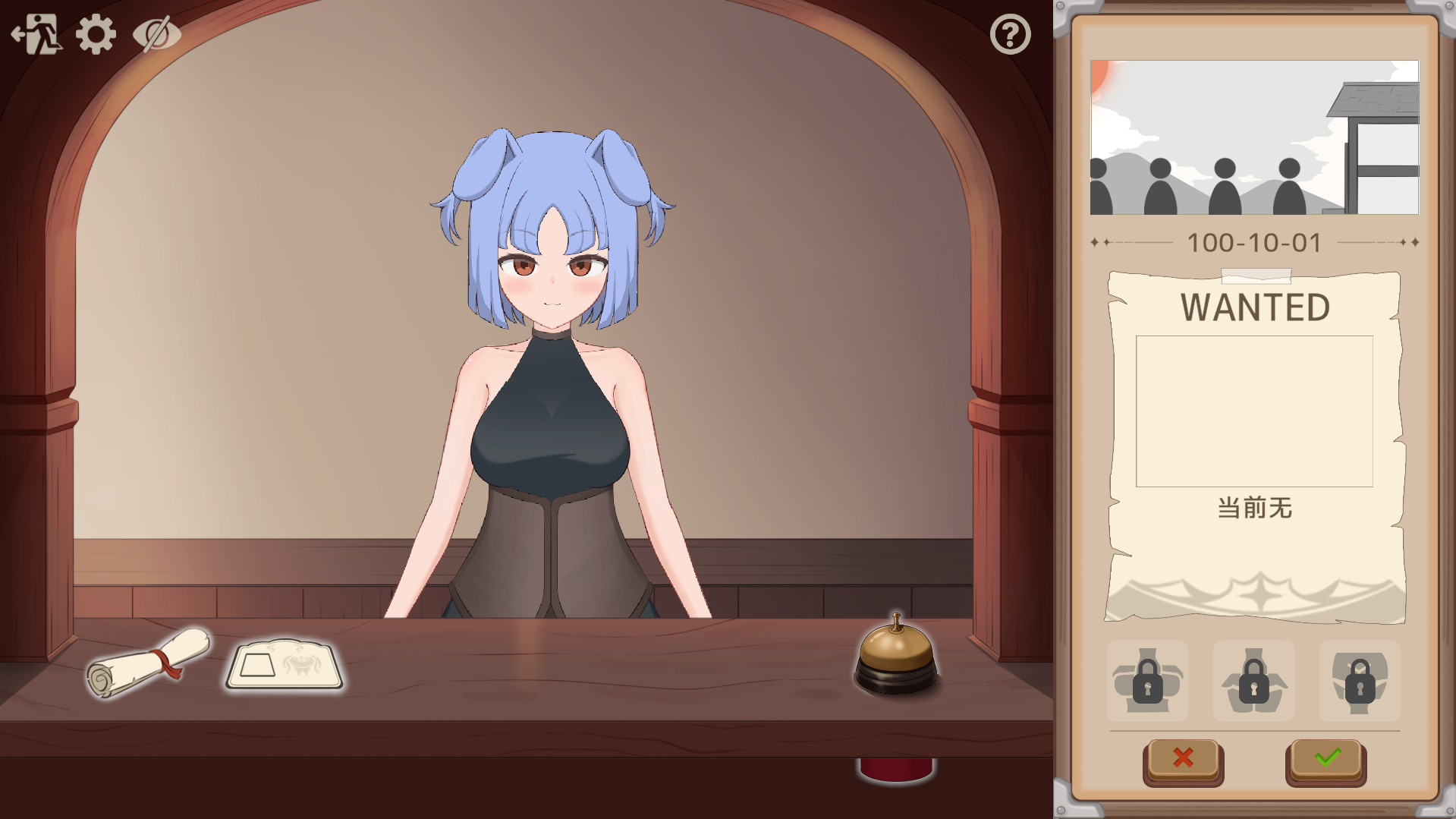 初始界面第4个选项(option)更改语言。 所有冒险者都将通过发型、发色、眼睛、嘴巴、胸部、身高等多种元素的随机组合生成。最初只是简单的文件审查,逐渐解锁诸如脱去衣物、触摸胸部等色情行为。 提交伪造文件的冒险者将被送往拘留所,并接受正式处罚。 通过推进公会业务,与同僚接待员的关系也会逐渐加深。过程中也会出现的各种H事件。 检查公会卡片是否存在可疑之处。检查任务文件是否存在问题。处罚不遵守公会规则的人! 伪造文件的冒险者将被送往拘留所!尽情处罚被送来的冒险者吧。随着等级提升,你还可以自由地对待心仪的冒险者。