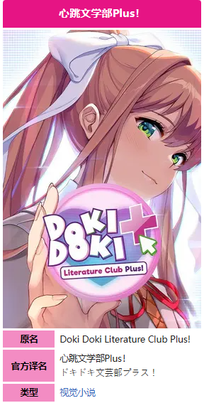 嗨,这里是莫妮卡! 欢迎加入文学部!我一直梦想着,可以为我热爱的事物做些特别的事情。既然你成为了社团的一员,那么你就可以帮我在这个可爱的游戏里实现梦想! 你每天都可以和四个可爱而又特殊的社团成员闲聊、进行有趣的活动: 纱世里,青春而又阳光,将幸福视为最重要的东西; 夏树,这个外表看起来可爱的女孩,可能随时都会给你自信一击; 优里,害羞而又神秘,在书的世界中寻找到了慰藉; ……当然还有,莫妮卡,文学部的部长!就是我! 我超级期待你能和所有人交上朋友,帮助文学部成为所有成员的贴心之处。我已经能看出来你是个小甜心了——你能保证和花最长的时间和我在一起吗?♥ 阅读更多:心跳文学部(https://mzh.moegirl.org.cn/%E5%BF%83%E8%B7%B3%E6%96%87%E5%AD%A6%E9%83%A8 ) 本文引自萌娘百科(https://mzh.moegirl.org.cn ),文字内容默认使用《知识共享 署名-非商业性使用-相同方式共享 3.0 中国大陆》协议。
